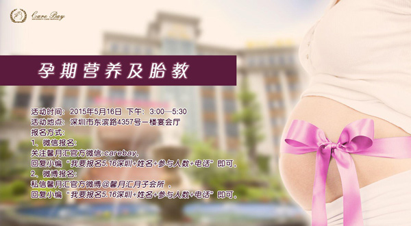 2015年5月16日,中国高端母婴专护服务第一品牌馨月汇(深圳)月子会所将以“孕期营养及胎教”为主题,举行浓重而又温馨的周年庆典活动。活动现场将有相关专业讲师为莅临现场的准爸爸准妈妈们讲授孕期营养和胎教的相关重要知识,所有想要参加的准爸爸准妈妈或其它家人,只需要在馨月汇月子会所官方微博微信进行报名即可。