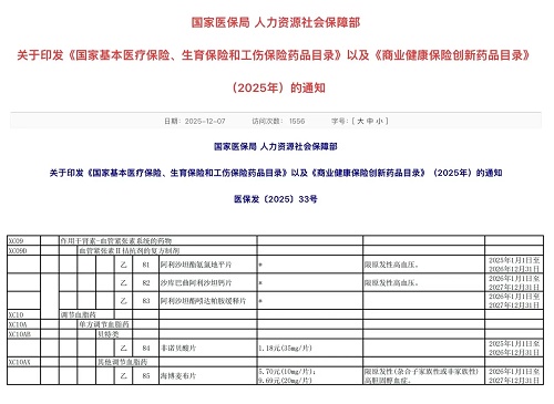 2025年12月7日,国家医保局、人力资源社会保障部公布《国家基本医疗保险、工伤保险和生育保险药品目录(2025年)》(以下简称 “国家医保目录” ),我国高血压新药——信立泰原研的复立安®(阿利沙坦酯吲达帕胺缓释片)成功准入新版国家医保目录。作为中国首个ARB+噻嗪样利尿剂复方降压药,为老年高血压患者提供强效平稳的血压控制,并有效控制夜间血压,降低心脑血管并发症风险,而且可以抵消或减轻使用吲达帕胺的不良反应,安全性更优。